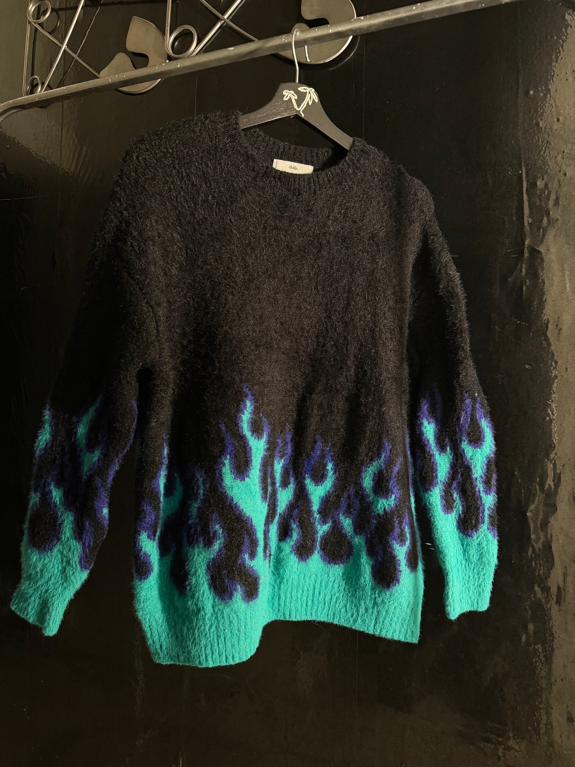 Adika Mohair Flame Print Pullover Sweater Black Blue Turquoise Fuzzy-Knit Crew