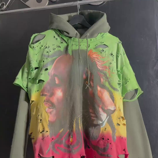 Bob Marley Lion Distressed Graphic Print Hoodie, Green Yellow Red Pullover