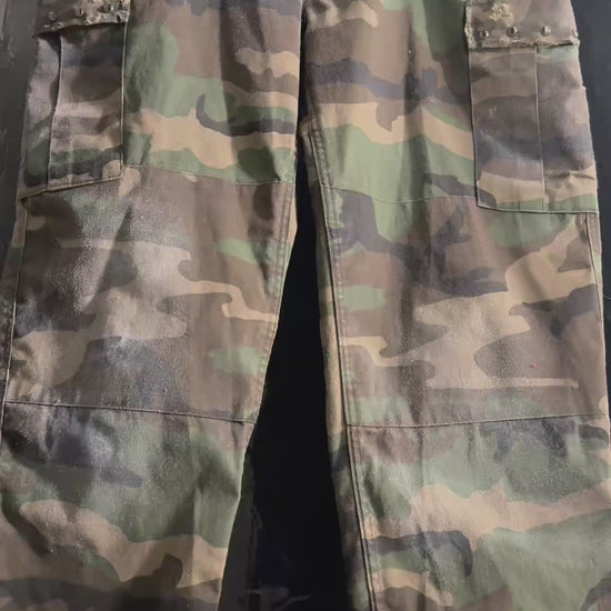 These are a pair of vintage reworked pants with pewter hardware. Size 35-39 inch waist. 30-32 inch inseam.