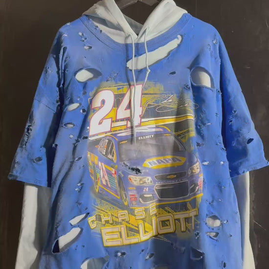 The Hendrick Motorsports Chase Elliott #24 Distressed Blue Hooded Shirt is a must-have for any NASCAR fan. Featuring the popular driver Chase Elliott and his team, Hendrick Motorsports, this hooded shirt is perfect for showing support for both on and off