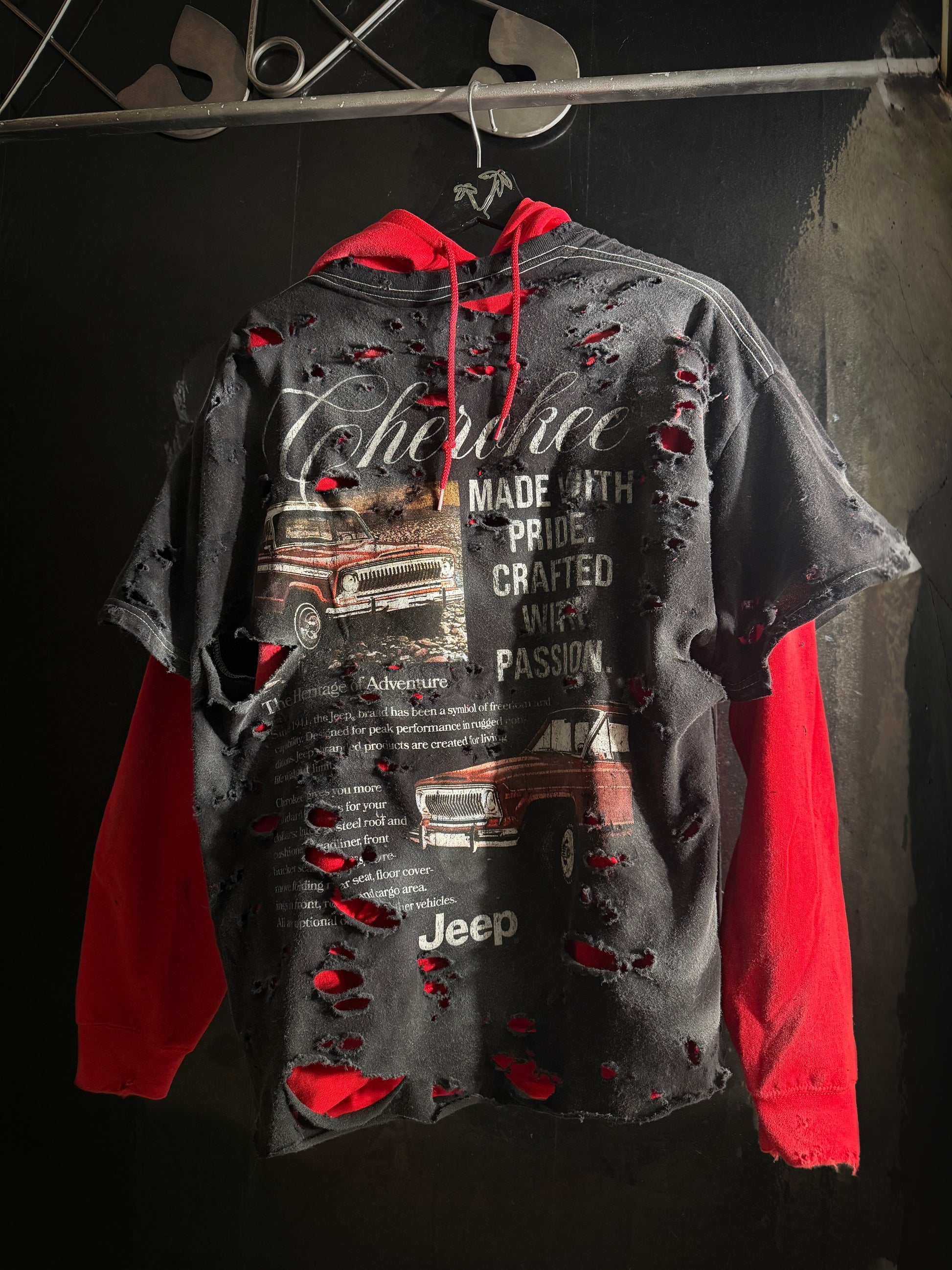 Jeep Cherokee Distressed Graphic Print Hoodie, Black Red Pullover