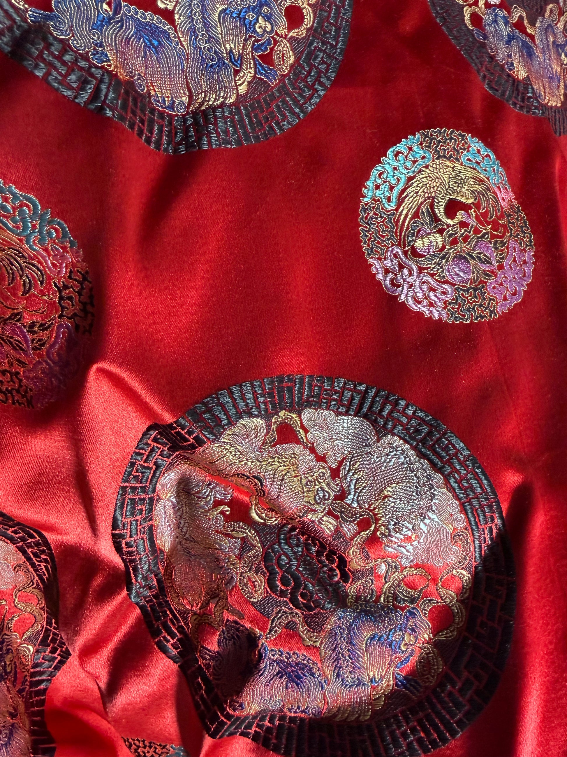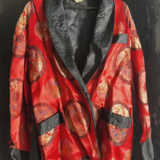 Men's Red Satin Robe Smoking Jacket Embroidered Quilted Black Collar Long Sleeve