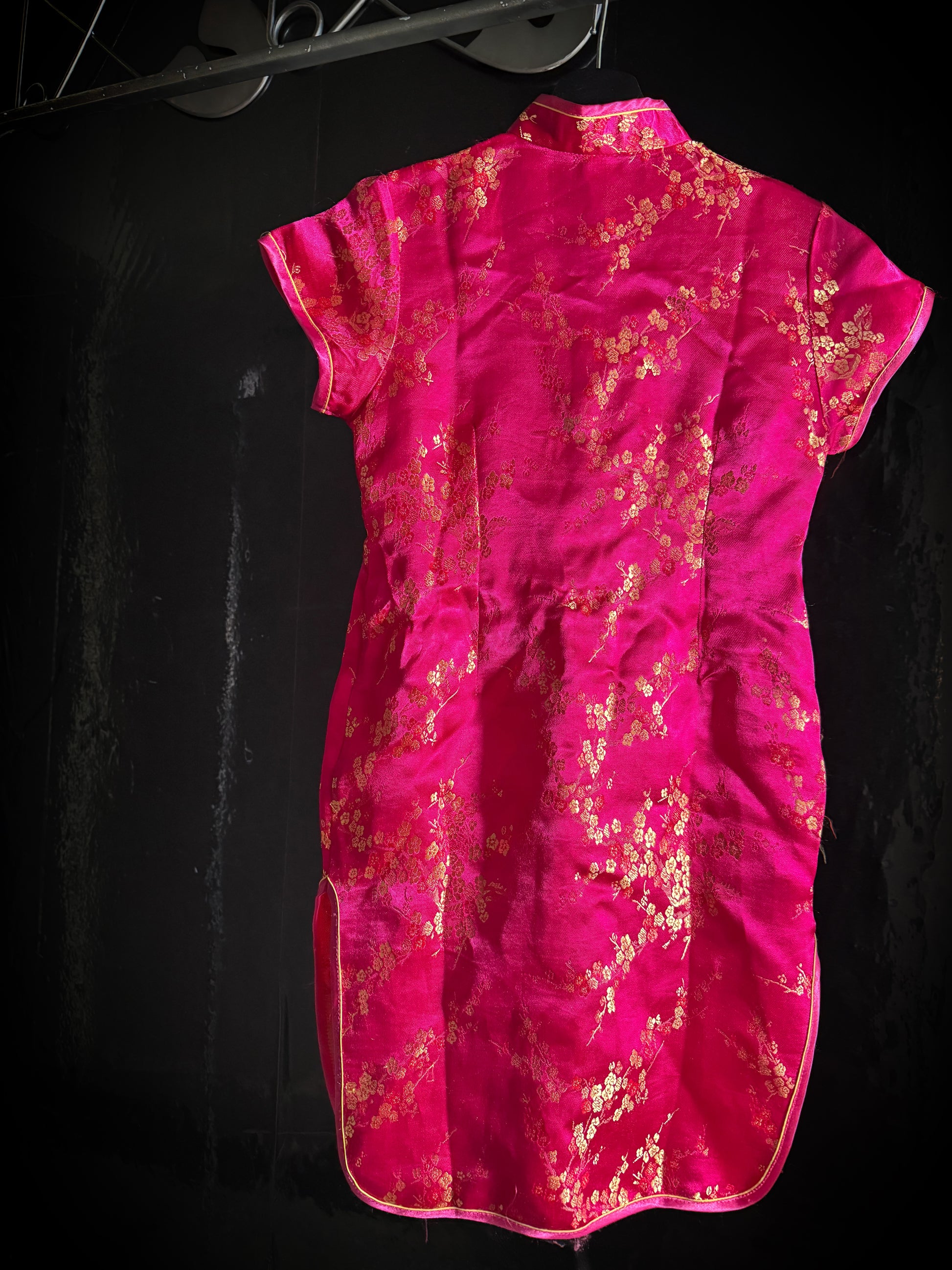 Pink Gold Satin Cheongsam Qipao Dress Embroidered Frog Closure Cap Sleeve