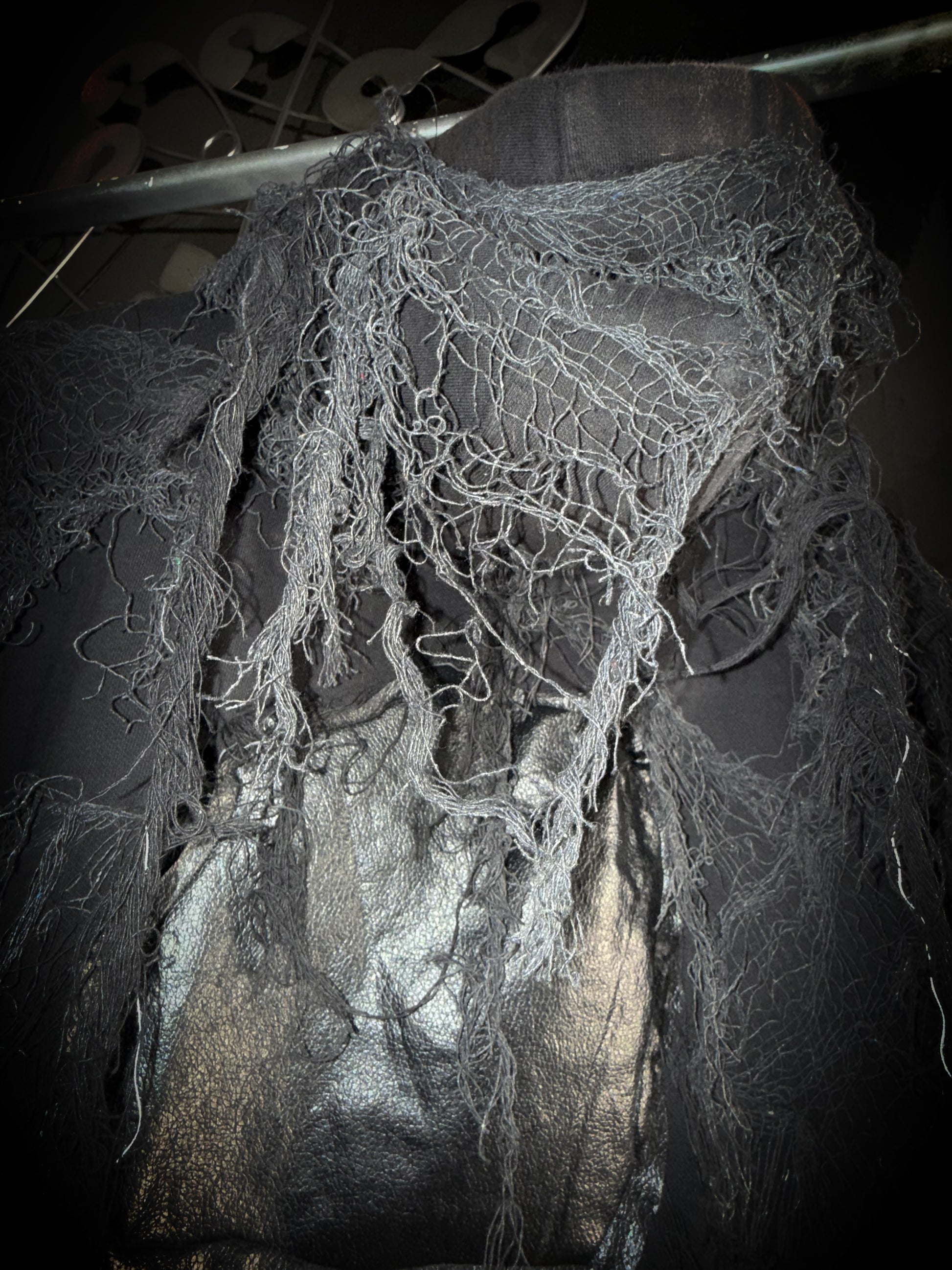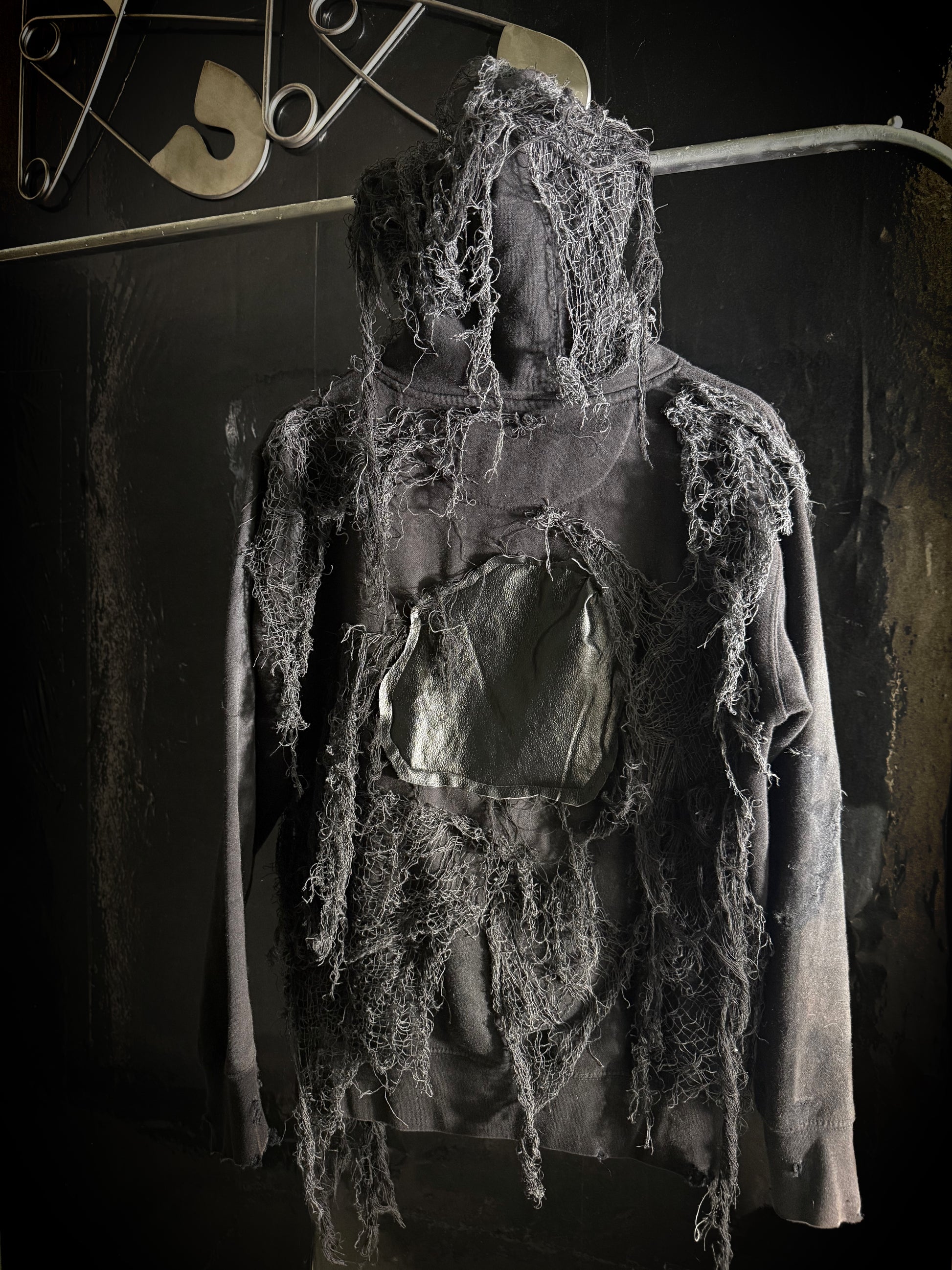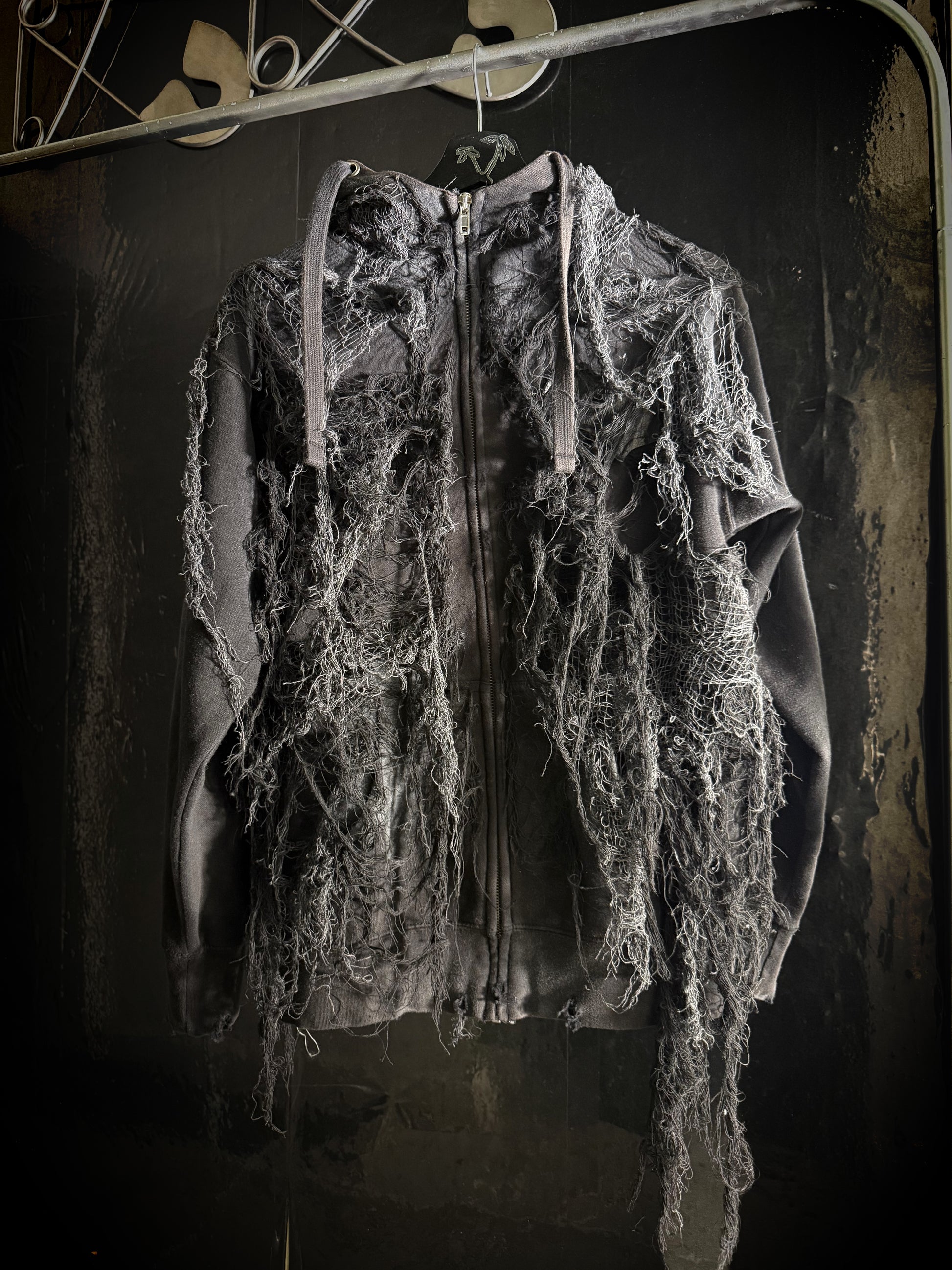 Black zip up hoodie with distressing and swamp matter on body of front and back of hoodie and hood.